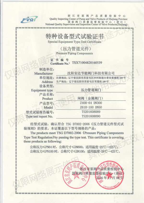 安達(dá)閥門特種設(shè)備實(shí)驗(yàn)證書(shū)